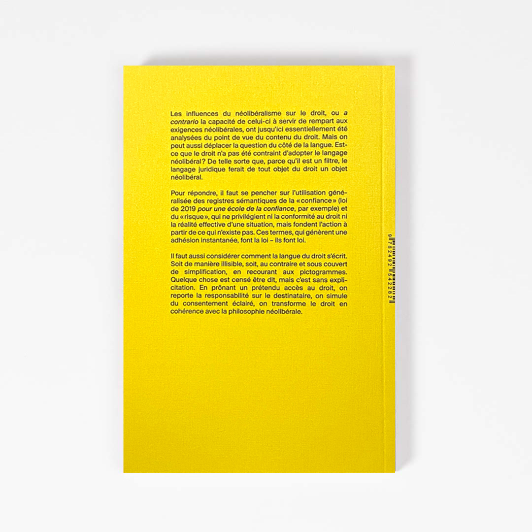 Il faut aussi considérer comment la langue du droit s’écrit. Soit de manière illisible, soit, au contraire et sous couvert de simplification, en recourant aux pictogrammes. Quelque chose est censé être dit, mais c’est sans explicitation. En prônant un prétendu accès au droit, on reporte la responsabilité sur le destinataire, on simule du consentement éclairé, on transforme le droit en cohérence avec la philosophie néolibérale.